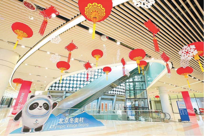 醒目的“BEIJING 2022”和“奥运五环”标识、可爱的冰墩墩伴着飞扬的雪花和雄伟的山脉元素,以及高高挂起的大红灯笼,新年第一天,距开村还有不到30天,北京冬奥村(冬残奥村)形象景观布置已基本就绪,多元素的融合将冬奥村(冬残奥村)装扮得韵味十足。