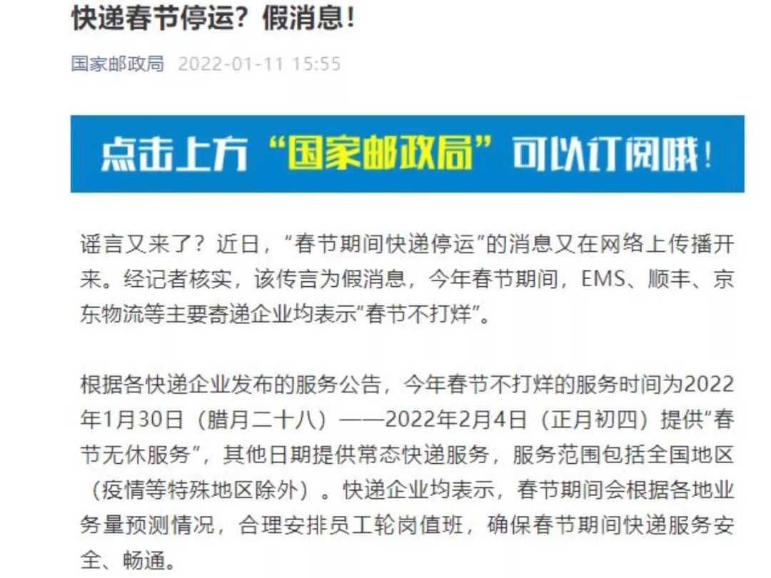 对此,国家邮政局1月11日通过微信公众号发文表示,“春节快递停运”为假消息,今年春节期间,EMS、顺丰、京东物流等主要寄递企业均表示“春节不打烊”。