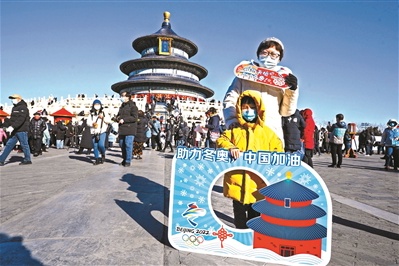 昨天是正月初一,市民纷纷来到天坛公园祈福过大年。今年春节,天坛公园将冬奥氛围与传统文化结合,打造了“识五谷、纳五福、过大年”等多场主题活动。图为市民合影留念。文并摄/本报记者 崔峻