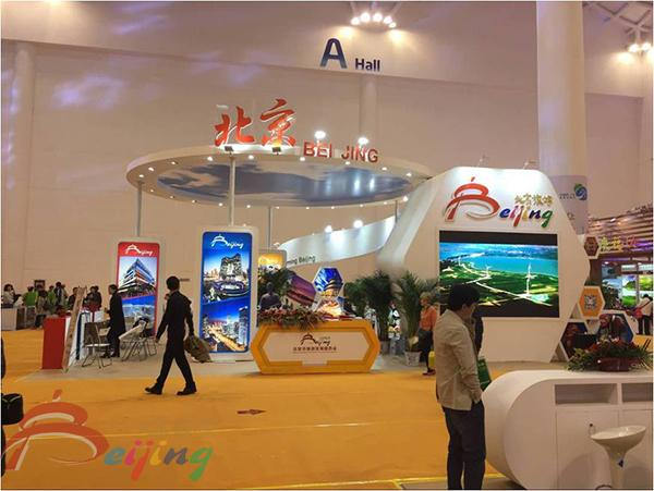 市旅游委展区位于主席台正前方,主要分为北京旅游形象展示和北京旅游企事业单位展示区两部分,搭建了以休闲旅游为主体风格的展示区、咨询台和洽谈区,为参展企业搭建了展示、交易的平台。