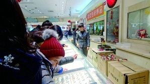 一家三口前来购买吊坠的刘女士告诉记者,今年是孩子的第一个本命年,春节又赶巧是孩子生日,所以特地来菜百为孩子选个“小金鸡”,“转了好半天,就想让孩子挑个最满意的”。眼见收银台前的队伍也是一条长龙,刘女士赶紧让先生先去排队以节省时间。