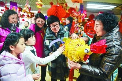 9日,在北京东城区崇外街道,已有300多年历史的崇外元宵灯会再次亮相,小区居民自发送来了用废旧纸盒、瓶罐等制作的鸡年主题环保花灯,亲手挂在活动现场。社区还组织了书法家现场写“福”字、非遗传承人现场制作刺绣和传统美食,共同庆祝元宵佳节。