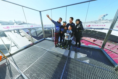 今天上午,鸟巢顶部观光走廊全新开放,鸟巢也因此成为世界上首座向大众全方位开放场馆屋面的奥运主体育场。据介绍,经过改造,现在整个鸟巢屋面南北贯通,游客可以全面领略国家体育场屋顶钢结构的壮美,俯瞰京城北部的风景。升级之后的鸟巢参观将继续维持原价位。(左颖文 程功摄)