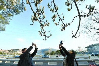 昨天,国家大剧院对面的长安街边,市民用手机拍摄初放的玉兰花。随着气温的回升,北京市城区内的多处玉兰花次第开放。 本报记者 和冠欣摄