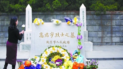 昨天,在高君宇烈士墓前,“五龙亭朗诵艺术团”的团员为烈士敬献鲜花并扫墓。