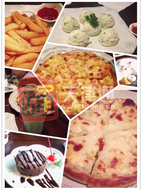 推荐理由:店面简单不浮夸,老板的用心体现到每一处细节,小胡子的杯子,可爱敦实的甜品勺子,小海豚造型的焗饭盘子,镂空的小食碟子。环境是那种美式餐馆的感觉,蓝色的主调,手绘的菜单,挺惬意的。推荐黑胡椒熏肉面、土豆沙拉、薯条、鱿点Q、榴莲披萨、情人虾、芝士焗饭。比萨最值得推荐!水果的和榴莲的味道都不错,用料很足!老板很可爱,做的蛋糕挺好吃。香蕉船和巧克力熔岩也都不错,但是熔岩相对有点腻,搭配个咖啡是不错的选择。