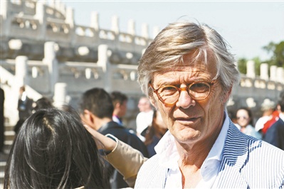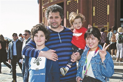 拉杜·裘德(左二)4月18日,第七届北京国际电影节“天坛奖”部分评委来到天坛祈年殿参观游览。昨日天晴日暖,虽然风力不小,但几位评委始终兴致勃勃,还不时与游人互动。供图/新华社