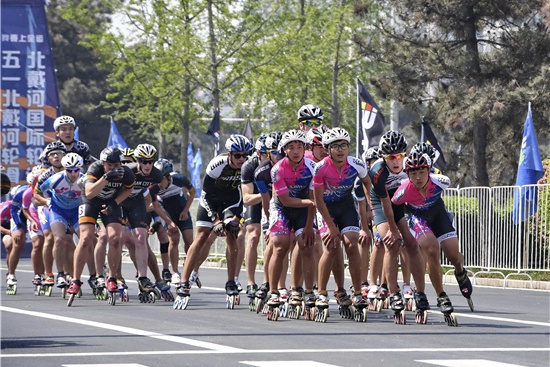 4月29日,参加北戴河国际速度轮滑马拉松公开赛的选手们在比赛中。当日,2017北戴河“运动之春”第十三届轮滑节在秦皇岛市北戴河区开幕。