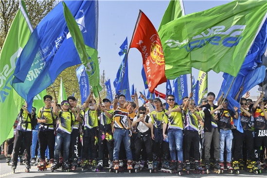 4月29日,轮滑爱好者们在滨海轮滑刷街狂欢活动中。当日,2017北戴河“运动之春”第十三届轮滑节在秦皇岛市北戴河区开幕。