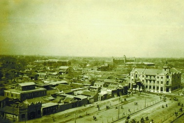 从正阳门城楼上由南向北拍摄的户部街。户部街在千步廊东侧,即今天广场东侧道路。路西是中华门和棋盘街花园,远处可见天安门及部分紫禁城宫殿;路东近处的空地是美军操场。1901年的《辛丑条约》规定,东交民巷使馆区周围划定一片区域作为各国驻军的操场。美军操场北面是东交民巷,巷西口矗立着一座牌楼,上书“敷文”二字匾,牌楼北是法国医院。