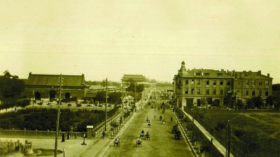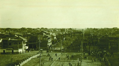 前门大街一直是北京城经济最繁荣的地区之一,从五牌楼起向南至天桥路口,两边店铺林立。1900年6月,前门外的老德记药店因为贩售西药而被义和团付之一炬,周遭店铺都受到牵连,甚至正阳门箭楼也被火烧毁。仅仅几年后,前门大街又重新恢复了往日的繁荣。顺着前门大街可看到中轴线最南端的永定门城楼。