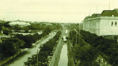 站在内城城墙上顺着御河向北拍摄。菖蒲河,也就是外金水河在皇城东南角折向南,然后经内城水关流向外城,流经内城的这一段称御河。图中右侧高大的建筑是北京当时最豪华的饭店——六国饭店,左侧的坡顶建筑是英国使馆。1931年至1933年,御河被掩埋填平,河道上方建了花园,成为今天的正义路。