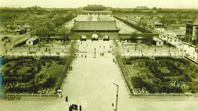 清代,天安门以南是由长安左门、长安右门以及大清门围成的T形区域,天安门至大清门的御路两旁原是连廊,称作千步廊。千步廊外是六部、五府和军机事务的办公地点,经历了1900年的庚子之变和清帝退位后,千步廊不仅完全丧失了作用,而且残破不堪。1915年在民国政府内务总长朱启钤的主持下,千步廊被拆,这里成为一片空旷的广场。明代紫禁城初建时,大清门称大明门,民国以后改称中华门,1959年被拆除。中华门至正阳门之间称为棋盘街。在朱启钤的主持下,棋盘街增建了两个花园。这张照片是在正阳门城楼上向北拍摄的,远处的景山、北海白塔、紫禁城角楼、午门、西华门、东华门清晰可见。