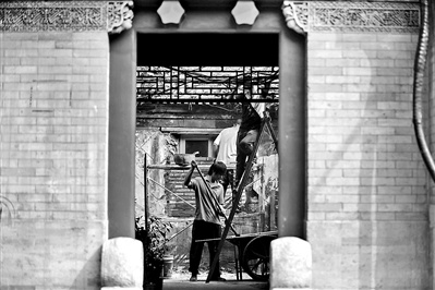 东四六条26号院的门楼是一座8平方米的民国西洋门,以前最简单的修复方式就是“老楼刷新漆”,而这次为了保护整修,朱旭花了4天时间,用钻子一块块刨掉了上面的饰面砖块,把水泥砖砂磨掉,让门楼上青灰色的石材露出真容。凑近了看,部分砖块已经开裂甚至脱落,而脱落的已经用相同材质的青砖填补,整个门楼看起来古朴、和谐。“为了防止砖块风化、腐蚀,我们还专门给砖块刷了一层硅树脂,使砖保持其本色。”