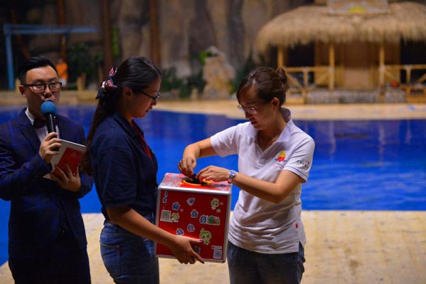 二等奖抽奖嘉宾中国工商银行安盛人寿保险公司业务发展总监乔金凤女士,为获奖的会员家庭送出360儿童手表。