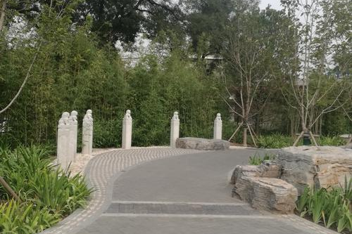在广场的东侧,有一条小径通往地铁口,小径的南边种植着海棠、碧桃、紫薇等一人多高的树木,北侧则栽了一排斑竹。这排斑竹一直延续到小广场台阶的后身儿,其中,局部还建了一个小景点儿:郁郁葱葱的斑竹前面,铺了一层白色的鹅卵石,鹅卵石中间,竖立着几根汉白玉的石柱,每个石柱上都顶着一只精雕细琢的小狮子。很多人从此经过,都忍不住去摸摸小狮子的头。在广场的西北角,有一个精巧的月亮门,通往龙头井胡同,方便居民进出。广场的西侧是一座长方形的廊亭,古香古色、雕梁画栋,好像从皇家园林里搬出来的一样。