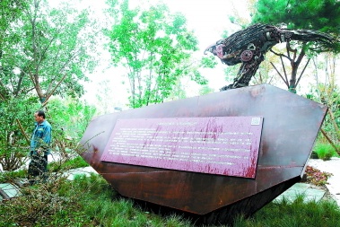 园子里有几处园林小品,虽说是雕塑,用的全是废弃钢丝、铁片、废旧轮胎等回收材料,搭配形态各异的石头,塑造成鸟儿造型、马儿造型、恐龙造型,趣味盎然,也暗合了城市森林的生态主题。