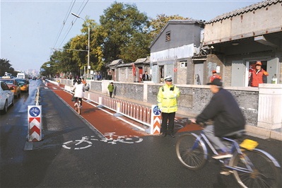 昨日上午,北京青年报记者在地铁6号线北海北站A口外看到,平安大街的最外侧路已经被护栏分为两条车道,地上施划着非机动车道标志。据交管局工作人员介绍,平安大街是中心城区的一条路况较为混乱的街道,为此交管部门结合平安大街的道路特点,充分考虑沿线的停车需求,采取了“内嵌式”停车的方式,即通过在最外侧设置非机动车道,采用隔离设施保证非机动车的通行,在隔离护栏内侧设置停车泊位或者临时停车区域。
