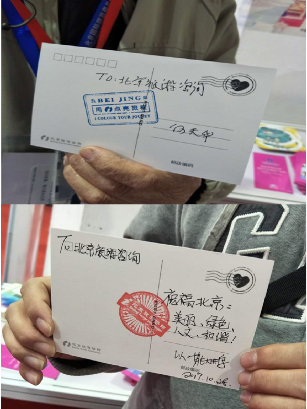 在展台旁,几位游客在领取到明信片后,写下“祝福北京”的寄语。这是北京旅游咨询服务中心为本次走进旅商会活动定制的主题明信片,现场共赠出了2000余张,备受游客们喜爱。大家在明信片上写下对北京旅游的意见和建议,更多游客决定将小小的卡片带回家珍藏。
