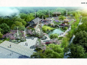 主要景观表现古城风韵,通过地雕、拱桥、大门等景观小品着力展现原始植物风貌。以绿色为基底,利用地势高差的不同,丰富景观内容,通过山水的打造,表现园林挖湖堆山叠石的技艺,营造山水融合的自然景观。