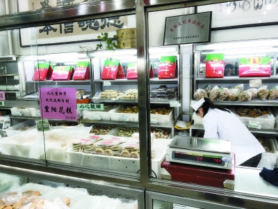 店面并不算大,玻璃柜台下面,糕点放在白色的大盒子里,表面敷上一层塑料纸,底下再垫一层吸油纸。服务员多是有些年龄的大妈大姐,服务态度还是老国营那种,不紧不慢、不卑不亢。就连台秤看起来也有些年头了。
