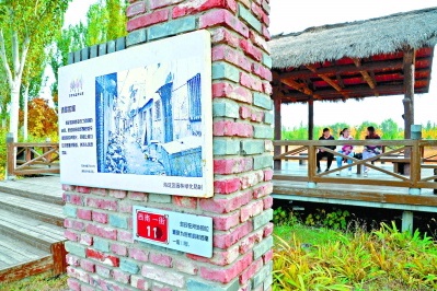 公园中常能看到这种红砖墙和老照片,这些都是用唐家岭地区拆迁、拆违后留下的材料打造而成。