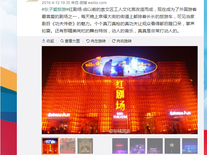 红剧场-由以前的崇文区工人文化宫改造而成,现在成为了外国游客最喜爱的剧场之一,每天晚上幸福大街的街道上都排着长长的旅游车,可见当家剧目《功夫传奇》的魅力。个个真刀真枪的真功夫让观众看得都目瞪口呆,掌声如雷。还有那精美绚烂的舞台特效,动人的音乐,真真是非常打动人的。