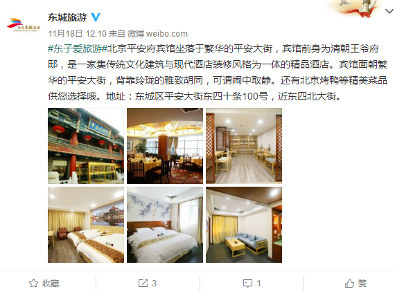 #东子爱旅游#北京平安府宾馆坐落于繁华的平安大街,宾馆前身为清朝王爷府邸,是一家集传统文化建筑与现代酒店装修风格为一体的精品酒店。宾馆面朝繁华的平安大街,背靠玲珑的雅致胡同,可谓闹中取静。还有北京烤鸭等精美菜品供您选择哦。地址:东城区平安大街东四十条100号,近东四北大街。