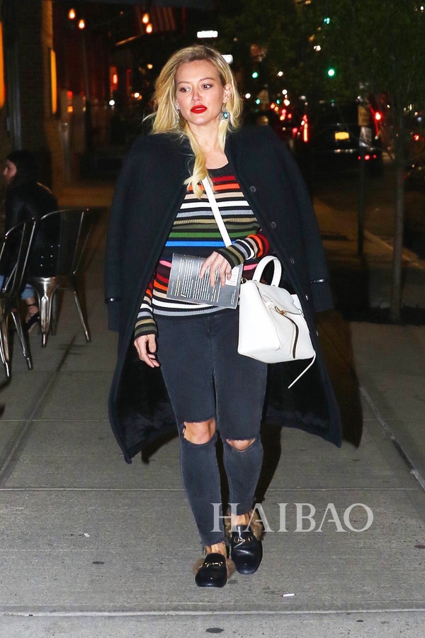 4月21日Hilary Duff身穿彩色条纹针织衫于纽约外出