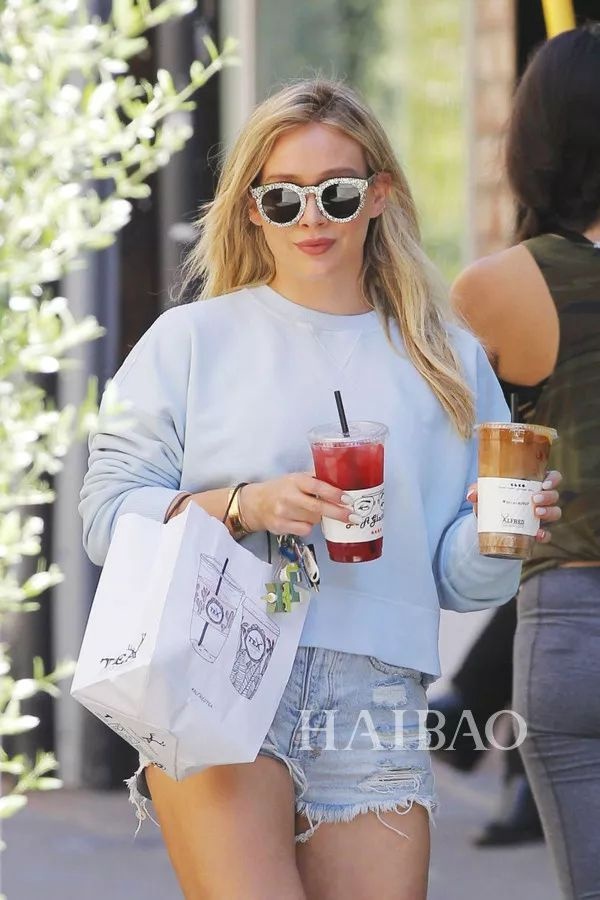 2017年5月22日,希拉里·达芙 (Hilary Duff)身穿套头卫衣配牛仔短裤于比弗利山庄外出