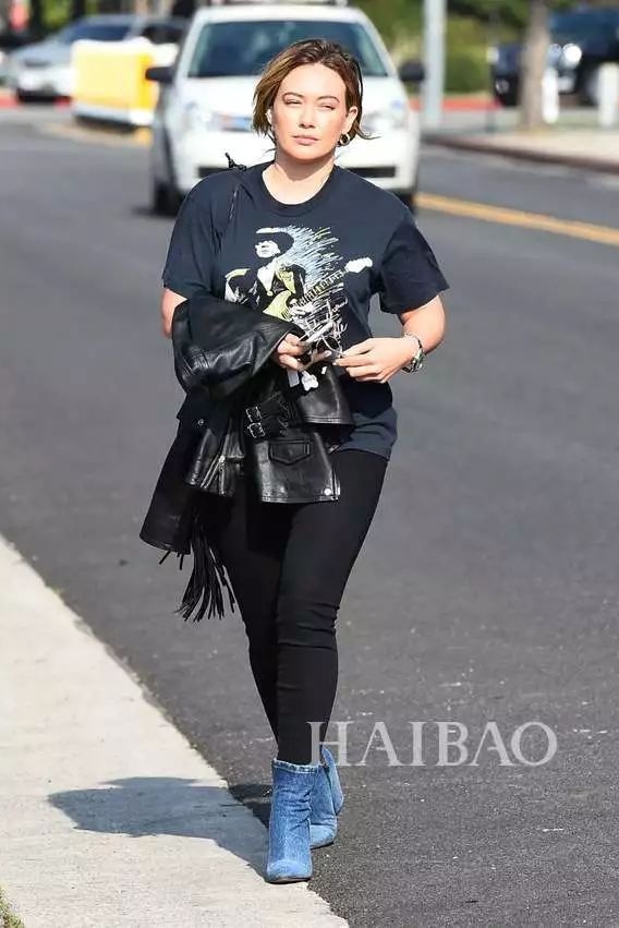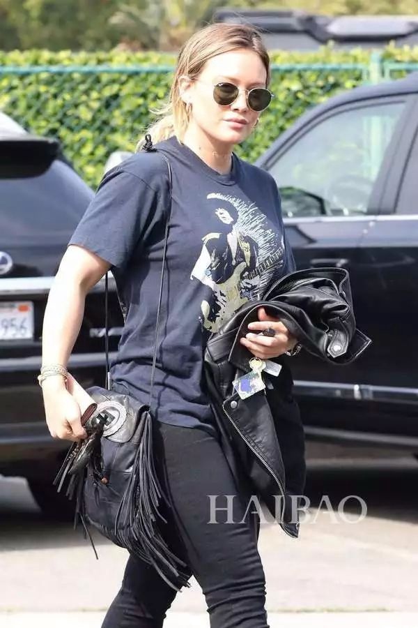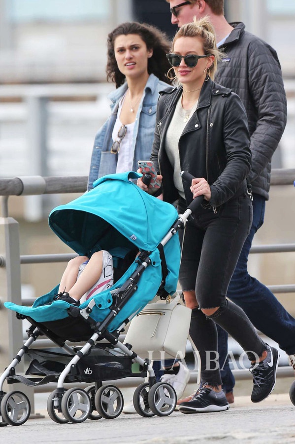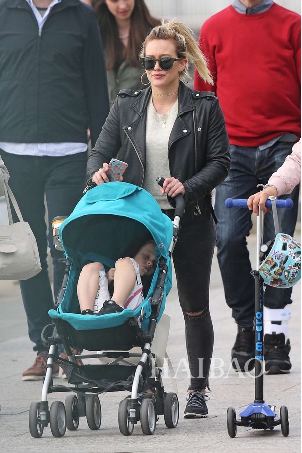 4月24日Hilary Duff身穿机车夹克搭配破洞裤于纽约外出
