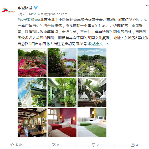 北京市北平小院国际青年旅舍坐落于老北京城胡同重点保护区,是一座百年历史的四合院建筑,原是清朝一个宦官的住宅。北近雍和宫、南锣鼓巷、段祺瑞执政府等景点,南近东单、王府井,伴有浓厚的商业气息外,更因周围众多名人故居的围绕,而带着与众不同的胡同文化氛围。地址:东城区5号线张自忠路D口出东四北大街汪芝麻胡同甲28号