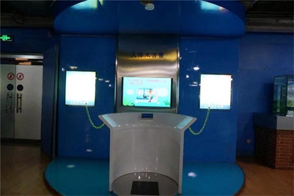 在参观的同时,你还能来这儿做一个小测试。当你站在这个测试台上时,计算机屏幕上就会直接地显示出自己身体中含水的比例情况。
