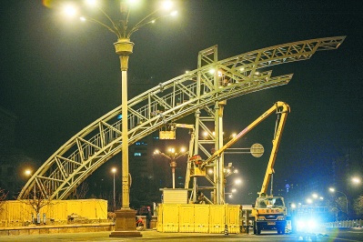 今日凌晨,长安街复兴门南北两侧原样重建的新彩虹门主体结构建起,预计1月31日前全部完工。彩虹门是为庆祝1997年香港回归而建,因已老化存在安全隐患,去年11月25日开始拆除。