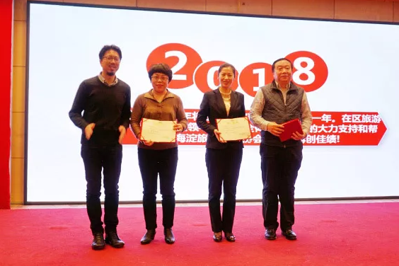 海淀区旅游行业协会秘书长要雁峥为紫玉饭店、首农香山会议中心、北邮科技酒店交流中心的代表们颁发组织策划奖。