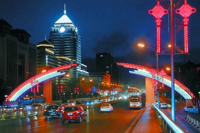 华灯初上,刚刚修缮完工的长安街彩虹门与鲜红的中国结灯饰为喜迎中国年的十里长街增添了浓浓的节日气息。