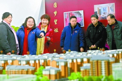 大年初五,望坛棚改居民重回社区过节。值守在岗的永外街道李村社区党委书记吴晶(左二)向居民们介绍棚改工作最新进展。本报记者 孙戉摄