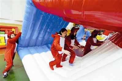 天津开发区总工会、开发区妇联主办,开发区俱乐部承办的开发区第29届“三八健康杯”趣味运动会,今天在开发区体育馆隆重举行,来自区内42家企业的700余名女职工参加。 周 伟摄