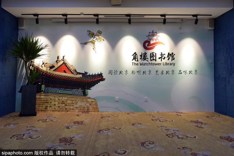 角楼图书馆一层为主题文化活动及展览展示区,主要举办老北京文化主题的展览。二层为图书阅览区,现有地方文献图书7000册、报纸30余种、期刊100余种。三层为辅助文化活动区,登上角楼外平台,可以一览京城美景。