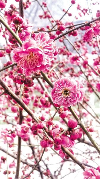 现下,民心河畔的红梅是初绽,枝条上花蕾密密匝匝,绽开的花朵还不多。