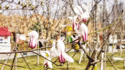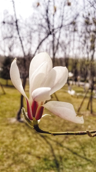 长安公园里牡丹园附近有两株白玉兰,花房西门旁和北侧绿地里栽的是紫玉兰,都开始进入花期。