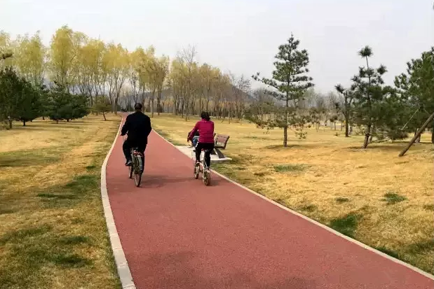 绿道宽约2.5米,红色的步道从草坪中蜿蜒穿过,绕湖半圈之后,从公园南门穿出,通往颐和园西门。空气清新,景色怡人。