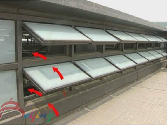 本建筑中庭高位设置电动开启窗,通过对建筑中庭的气流组织进行模拟,在过度季利用自然通风消除室内余热。