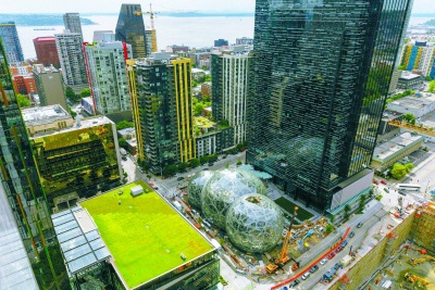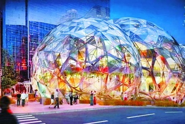 提起亚马逊,有人想到了美国科技巨头,有人则想起了南美洲的热带雨林,就在不久前,亚马逊公司还真把“热带雨林”搬进了门。三个最大直径接近40米的球形外壳,多达2643块的表层玻璃覆盖,这座位于西雅图的神奇建筑,无论从哪个角度看上去,都像是城市中心的一个巨型温室。这便是亚马逊公司耗资约合人民币250亿元,历时59个月最新打造的公司总部——the Spheres。