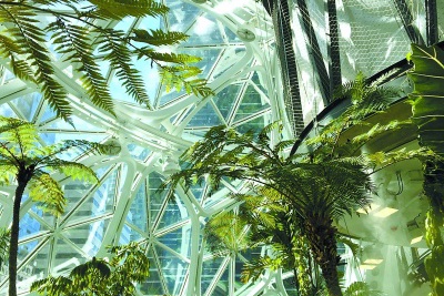 这座怎么看都不像办公楼而更像温室大棚的总部,的确是植物的天堂。从附着于墙壁生长的小型攀援植物到高达十五米的大榕树,多达400多种来自世界各地50个国家的四万余株植物在此安家。这里就是一个迷你微缩版的热带雨林,它将美丽的大自然带入了西雅图市中心的核心地带。