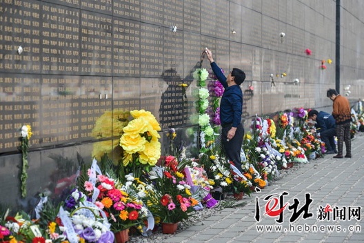 4月1日,临近清明,唐山地震遗址纪念公园内,人们献上鲜花,祭奠在大地震中罹难的亲属和在抗震救灾中英勇牺牲的英雄。 记者赵杰摄