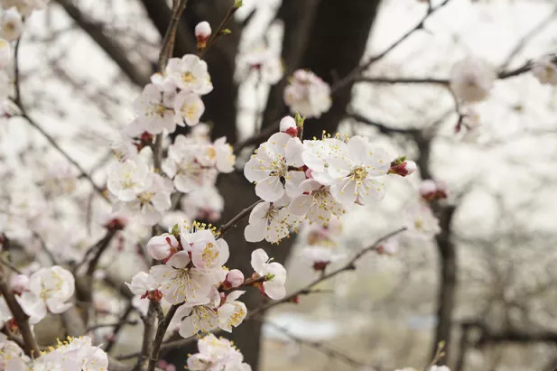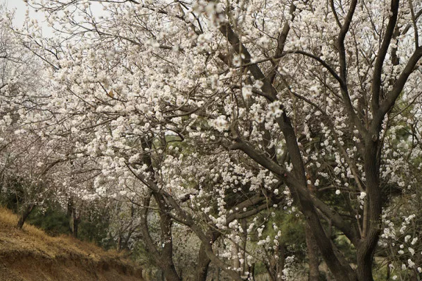 野生的山杏花一团团、一簇簇盛开,白的如银似雪,让整个百望山都变得格外迷人。