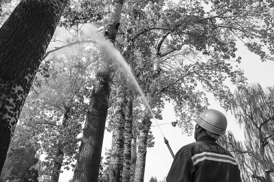 昨天,市园林绿化局在人定湖公园举行杨柳飞絮治理现场会。现场展示的治理手段主要有三种:一是给杨柳树注射花芽抑制剂,这种方式可以保证来年这棵树不会开花,也不会飞絮;二是高压水枪喷射树冠,这一招“立竿见影”,飞絮立刻被水柱打到树下,停滞在湿漉漉的草地上。三是修剪过密的枝条,减少飞絮总量。