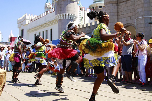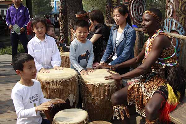 公园非洲区里:来自乌干达的非洲草裙鼓手们,在非洲部落的图腾旁,狂野地敲击着羊皮鼓,他们时而喜上眉梢,时而愁眉不展,时而窃窃细语,又时而开怀大笑,以他们特有的方式,演艺着部落追猎、打谷、野炊、恋爱、丰收等生活场景,通过鼓、舞、歌、演、情,迸发着原始的激情。他们以舞叙事、以鼓传情、以歌抒怀、以情言心、以演动人,让人身临其境地陶醉在非洲土著部落的风情中。最后与小朋友体验非洲鼓、拍照,让活动达到高潮。