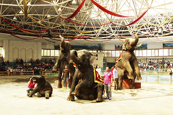 公园泰国大象馆:大象摇呼啦圈、行走独木桥、踢足球、跳森林迪斯科,象鼻带草帽、象鼻托举、零距离喂大象香蕉等互动活动,给小朋友带来无尽的欢乐。